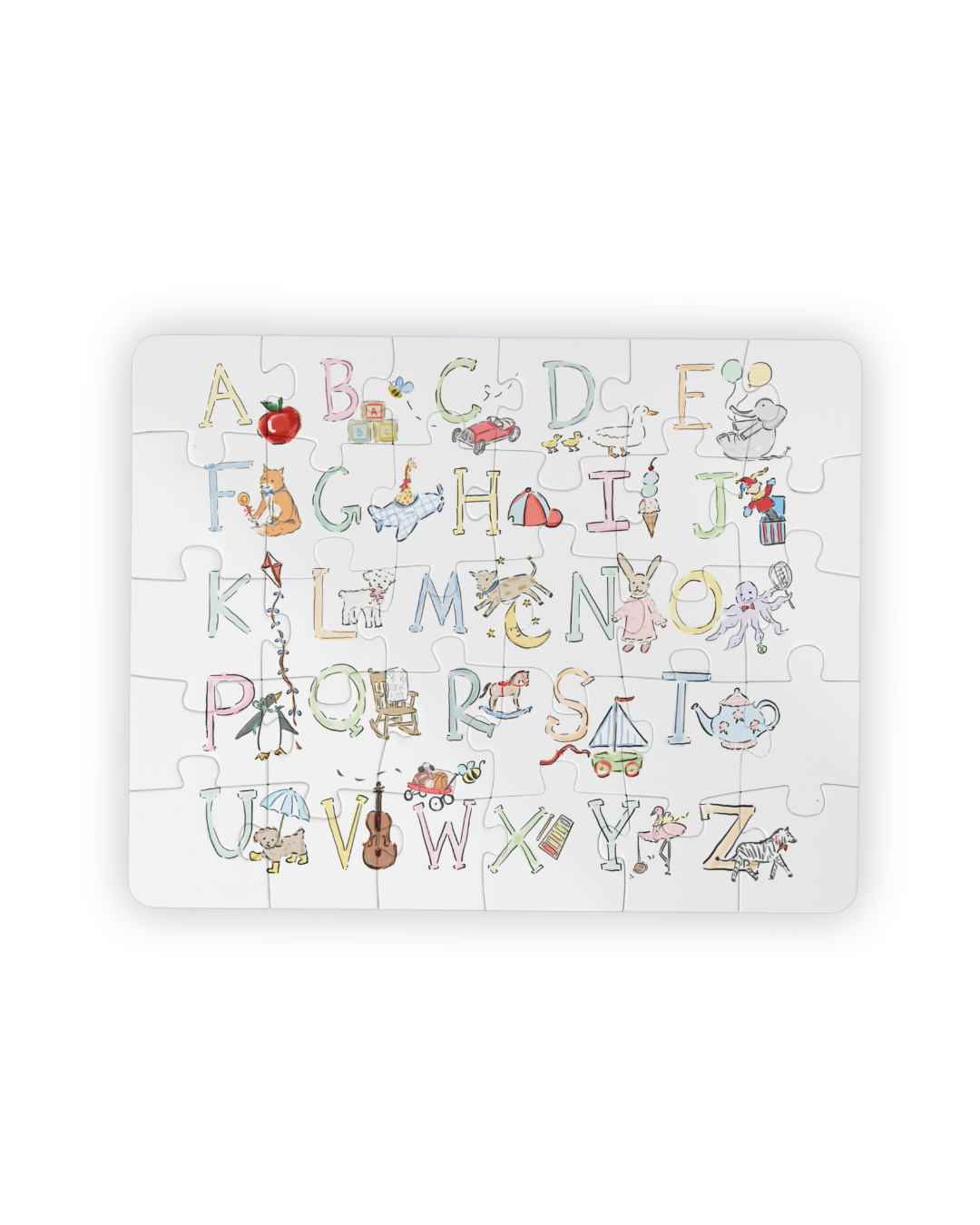Bright, chunky puzzle designed for little hands and curious minds. Each large, rounded chipboard piece slots together easily and features a colorful scene tied to the alphabet letters paired with playful illustrations that invite naming, storytelling, and early letter practice. The laminated surface holds up to repeated play and clean-ups, while the included box shows the full image as a handy reference. Spread the pieces on the playroom floor and watch a calm, focused moment unfold as a child points at letters, practices sounds, and connects images to words.
