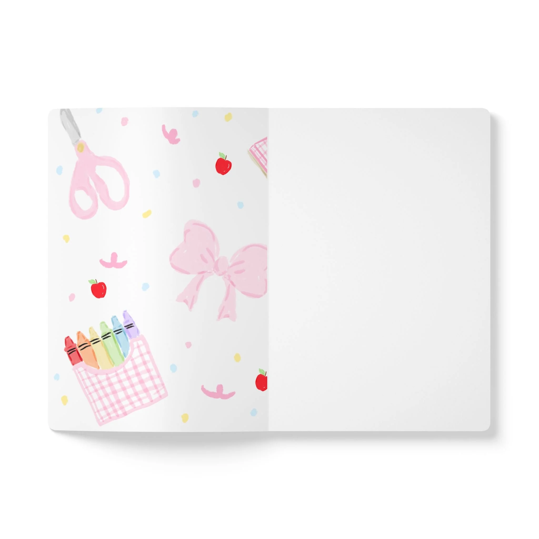This softcover journal slips easily into backpacks and teacher bags, brightening a busy day with its playful bow-and-pink cover. It feels lively and organized — pages that lay ready for lesson plans, doodles between classes, or notes during parent-teacher chats. Perforated sheets let students hand in homework or tear out a quick list without disturbing the rest of the book. The satin cover and rounded corners stand up to daily handling, while the compact size fits small hands and crowded desks. Available in two thicknesses, it adapts to a short-term project or an entire semester of notes. Thoughtful inner prints add personality without getting in the way of whatever the day demands.
