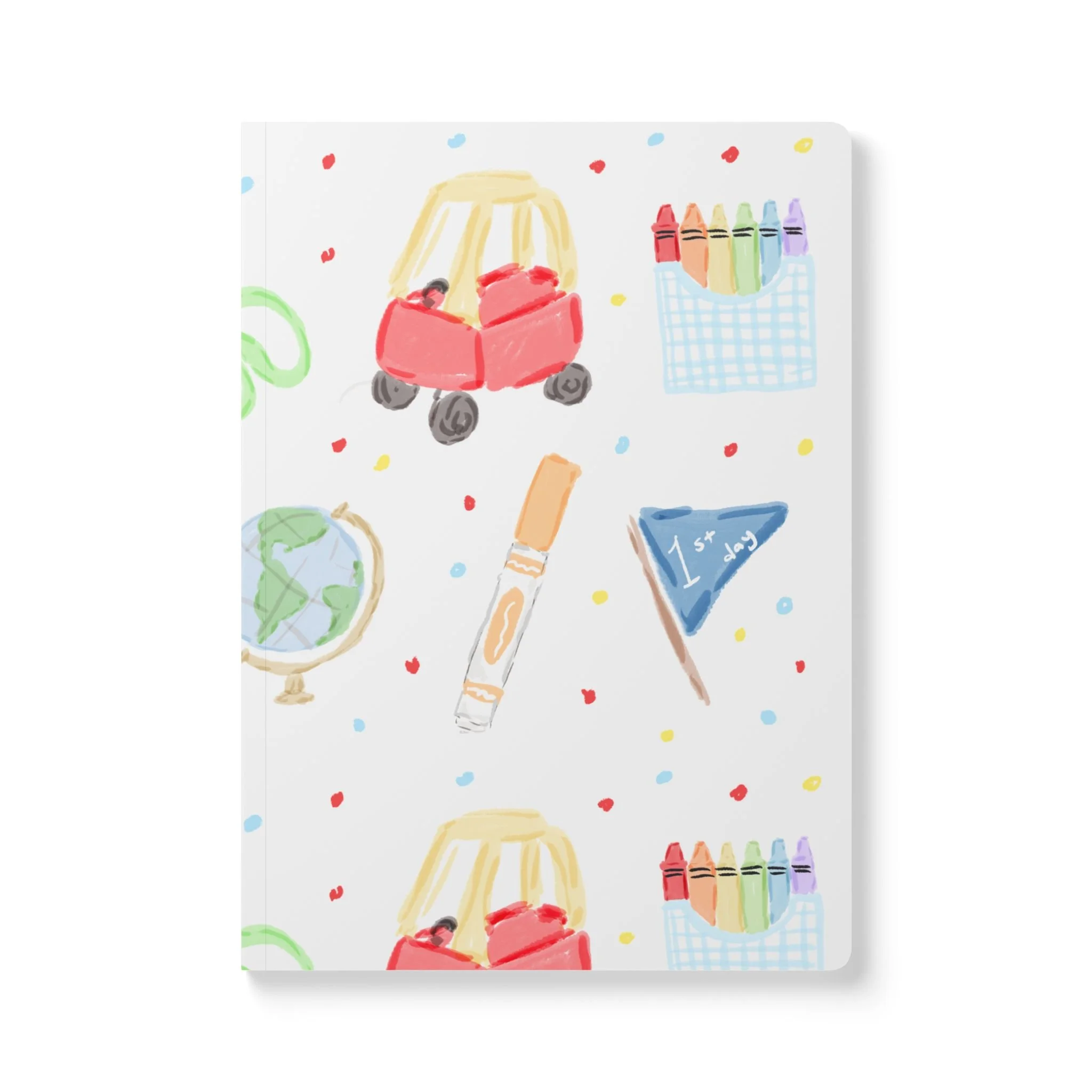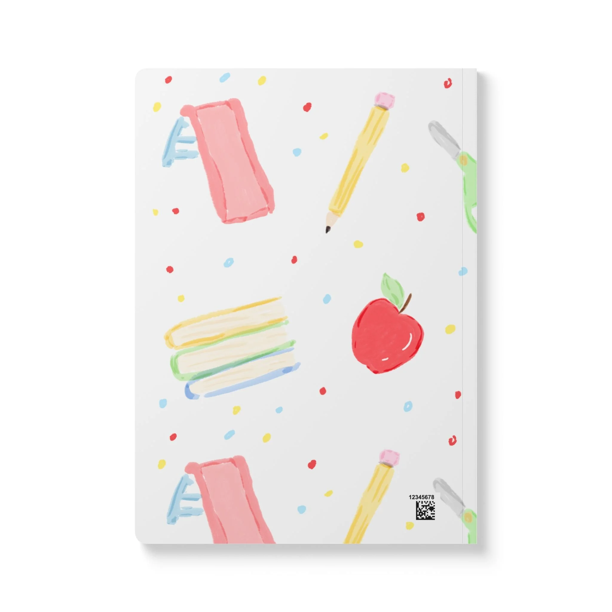 This softcover journal brings the bright energy of a new school year into your everyday notes. Its lively, high-definition colors make doodles pop and headings stand out, while the soft satin cover and rounded corners feel familiar and friendly in your hands. Lightweight yet sturdy, the compact 5.75" x 8" size slips into backpacks and tote bags without weighing you down. Perforated pages let you share assignments, sketches, or reminders on the fly. Choose between 100 or 200 pages to match your semester load, and use the six customizable inner pages to set up a schedule, subject tabs, or an index that keeps everything organized. Assembled in the USA, this journal fits right into the rhythm of school days—notes between classes, plans for group projects, and quick bursts of creativity between lessons.