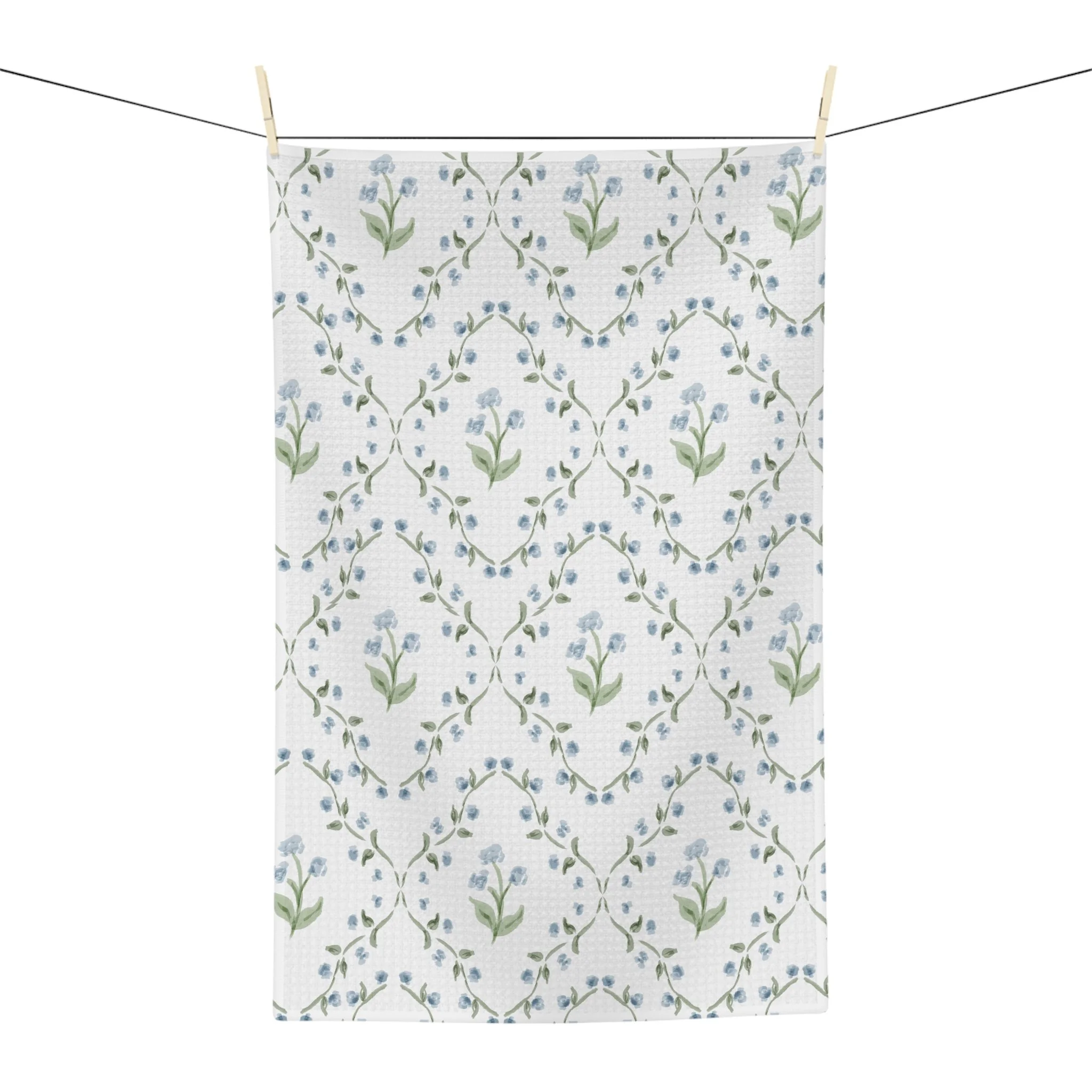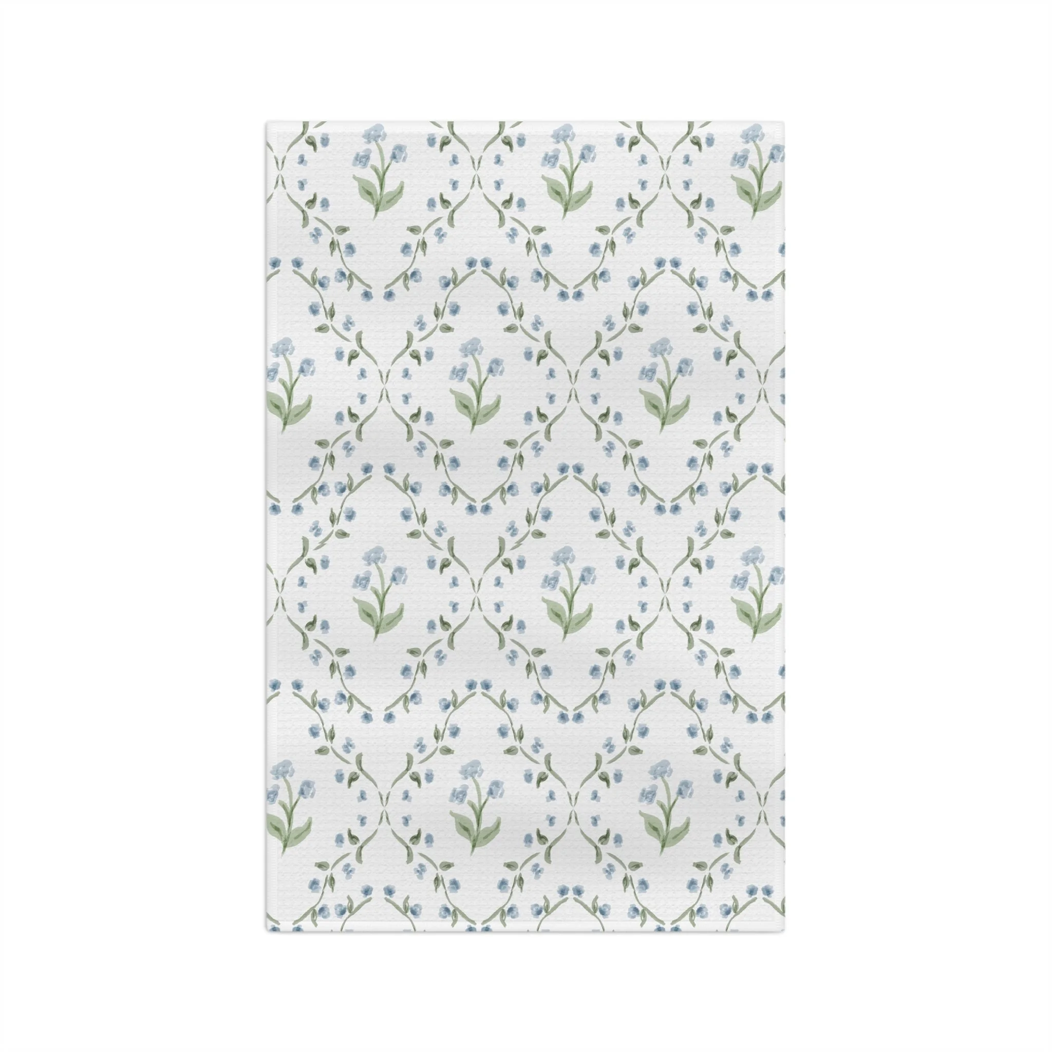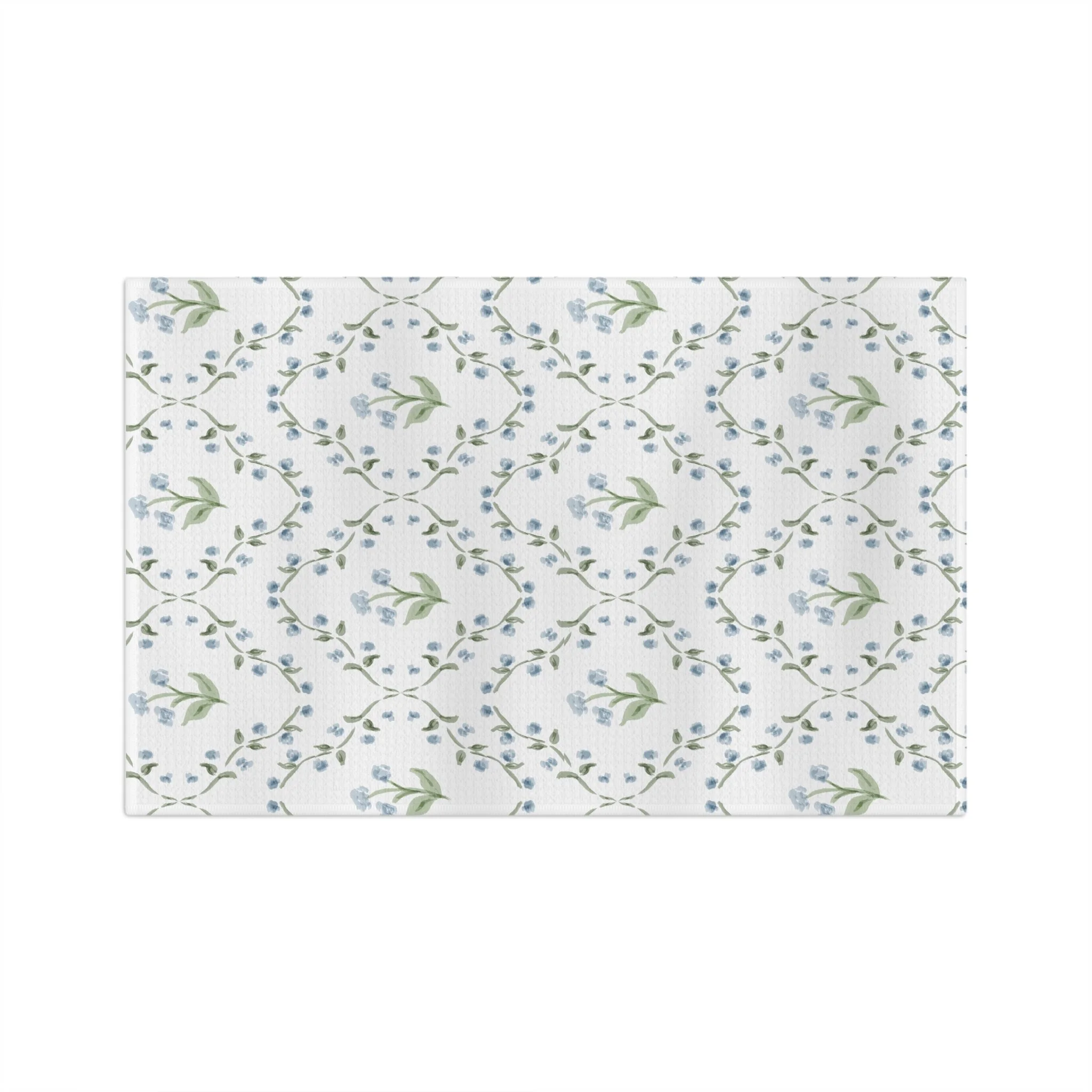Soft, absorbent microfiber woven into a delicate floral repeat that brings a quietly vintage charm to everyday kitchen chores. Light blue buds and olive leaves drift across a cream ground in a gentle lattice, adding a calm, cottagey note to dish duty, tea prep, or morning light on the counter. Thin, quick-drying fibers make cleanup effortless; hemmed edges keep the towel looking neat after many washes. It wears like a little piece of the garden — subtle, fresh, and quietly cheerful when you reach for it.